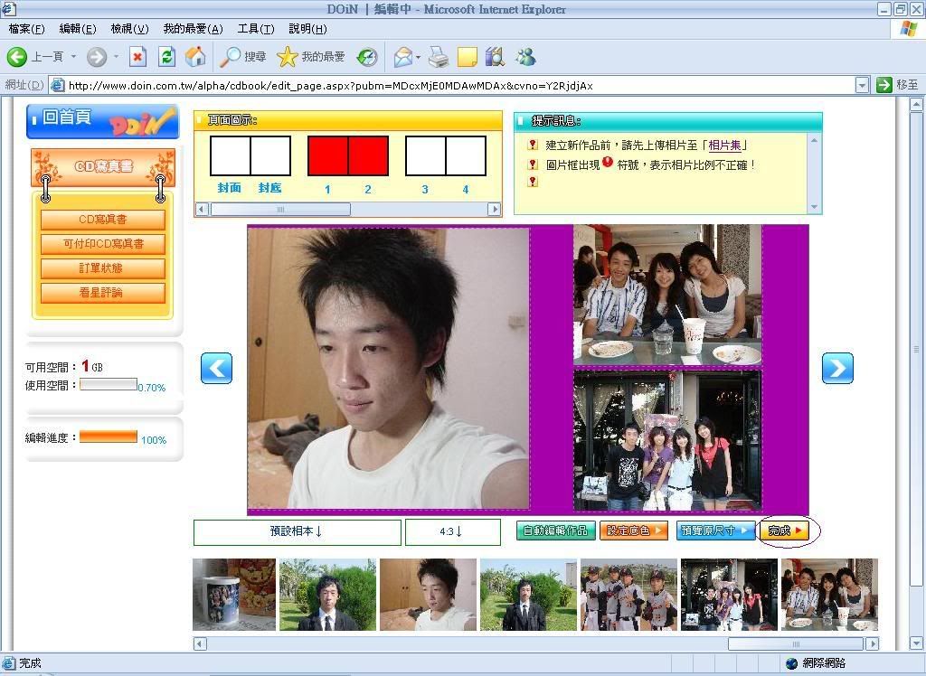 當你10頁的內頁都設定完成 解析度沒問題 每張照片選擇的範圍也沒問題 就可以選右下角的完成